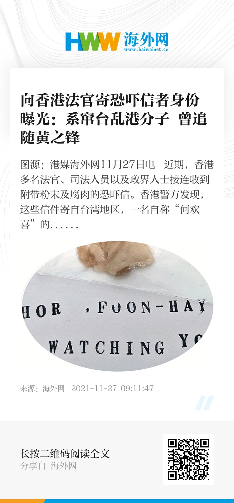 海外网11月27日电 近期,香港多名法官、司法人员以及政界人士接连收到附带粉末及腐肉的恐吓信。香港警方发现,这些信件寄自台湾地区,一名自称“何欢喜”的窜台乱港分子随后在社交平台承认对此事负责。