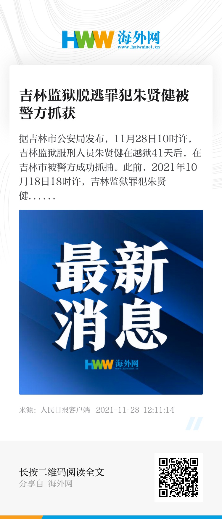 据吉林市公安局发布,11月28日10时许,吉林监狱服刑人员朱贤健在越狱41天后,在吉林市被警方成功抓捕。