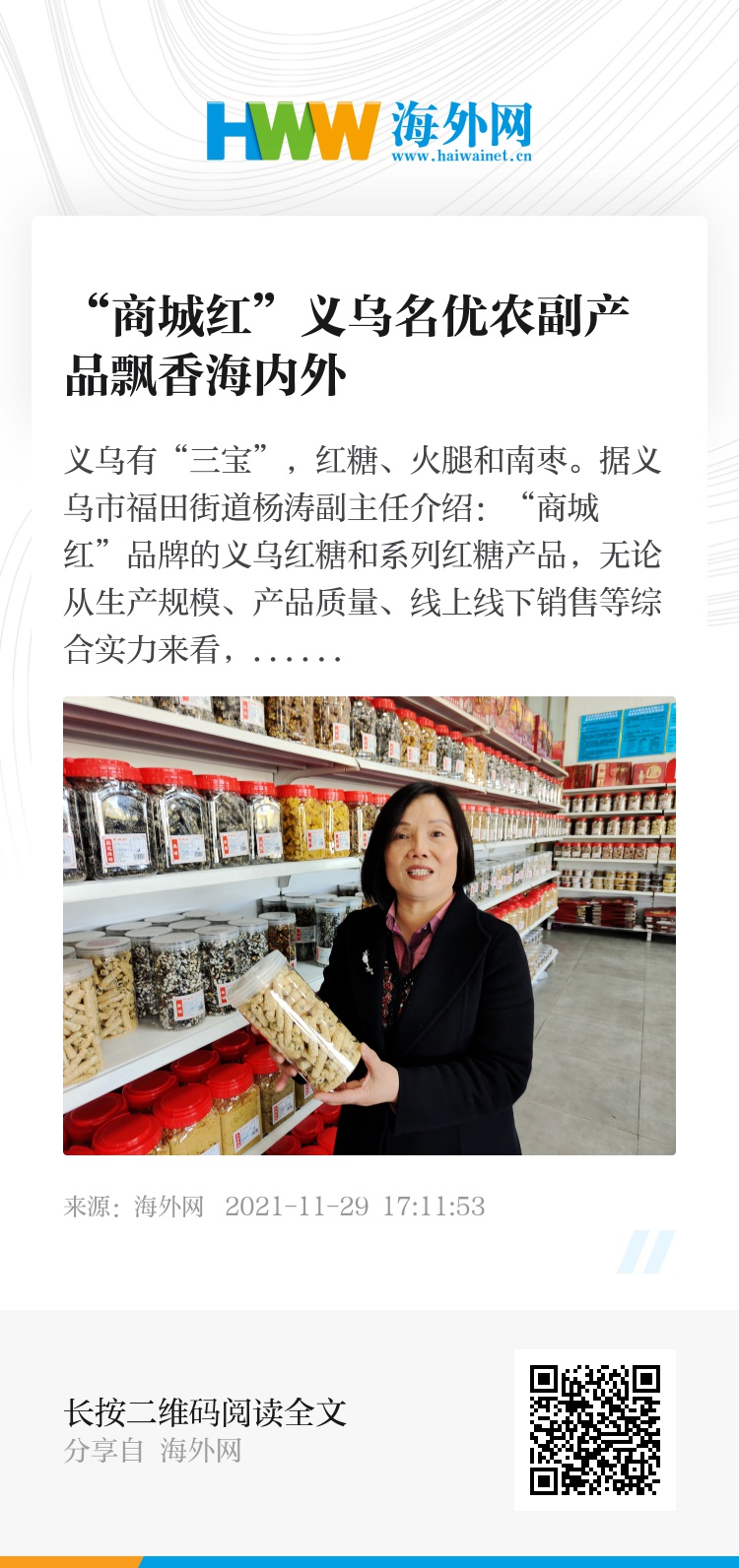 据义乌市福田街道杨涛副主任介绍:“商城红”品牌的义乌红糖和系列红糖产品,无论从生产规模、产品质量、线上线下销售等综合实力来看,在全市40多家红糖厂中,可谓是行业中的佼佼者,义乌市农副产品的金字招牌。
