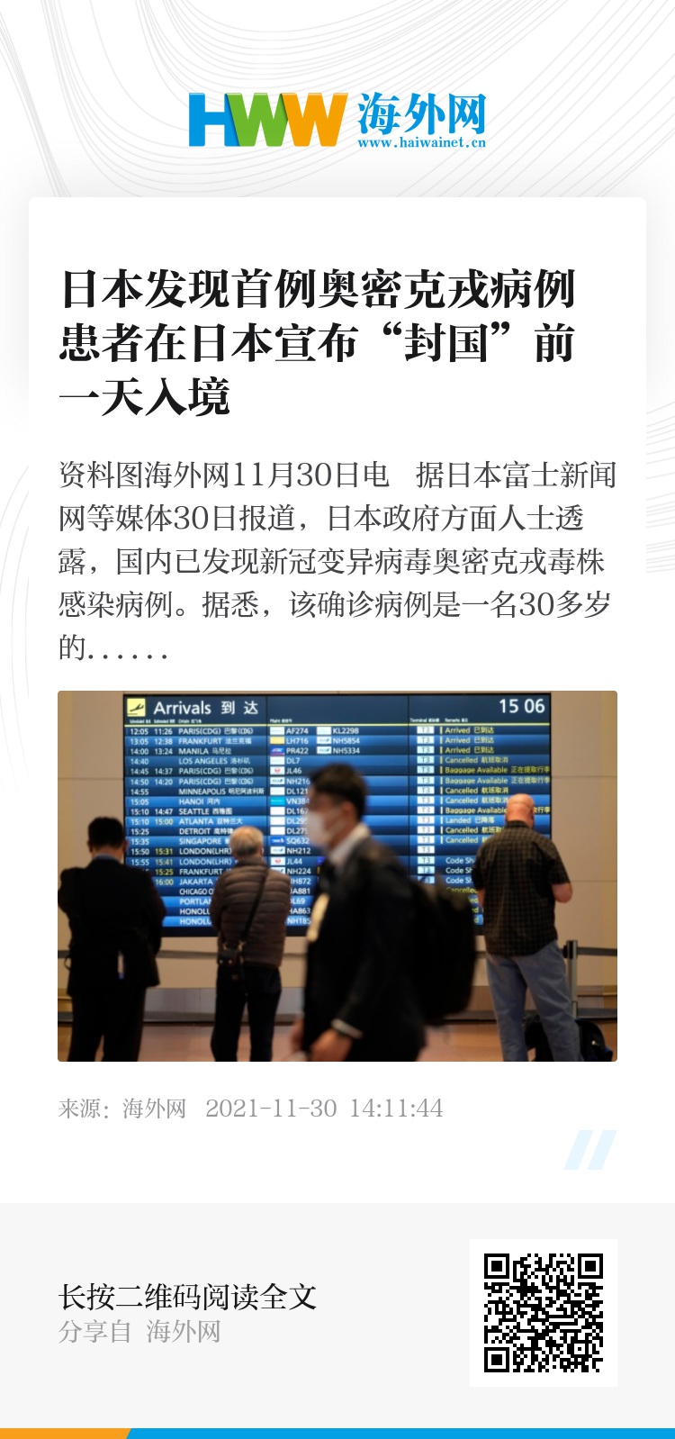 海外网11月30日电 据日本富士新闻网等媒体30日报道,日本政府方面人士透露,国内已发现新冠变异病毒奥密克戎毒株感染病例。据悉,该确诊病例是一名30多岁的男子,于11月28日抵达日本成田机场。他曾前往非洲国家纳米比亚。日本称,这是日本国内首次确认发现奥密克戎毒株感染病例。