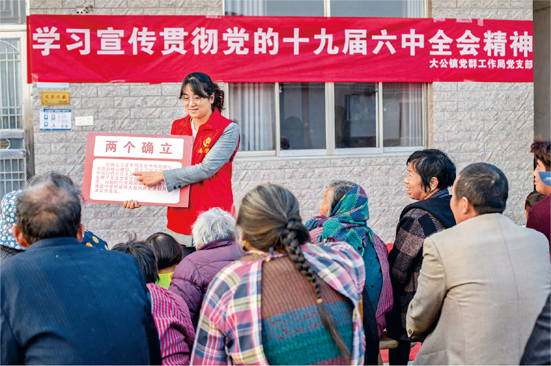 2021年11月18日,江苏省南通市海安市大公镇党员志愿者在常河村12组向村民宣传党的十九届六中全会精神,用老百姓听得懂、能领会的方式将全会精神传达到基层。 人民视觉 翟慧勇/摄