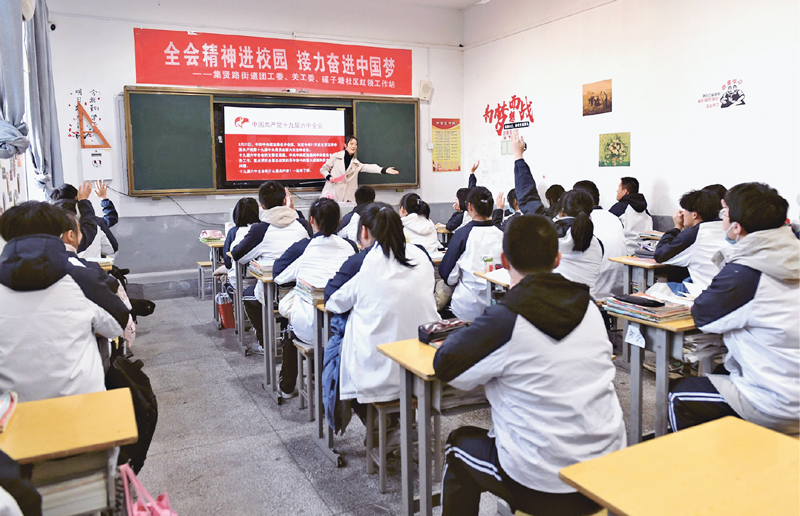 2021年11月24日,安徽省安庆市大观区集贤路街道团工委、碟子塘社区红领工作站联合开展党的十九届六中全会精神宣讲进校园活动。 中新社发 项顺平/摄