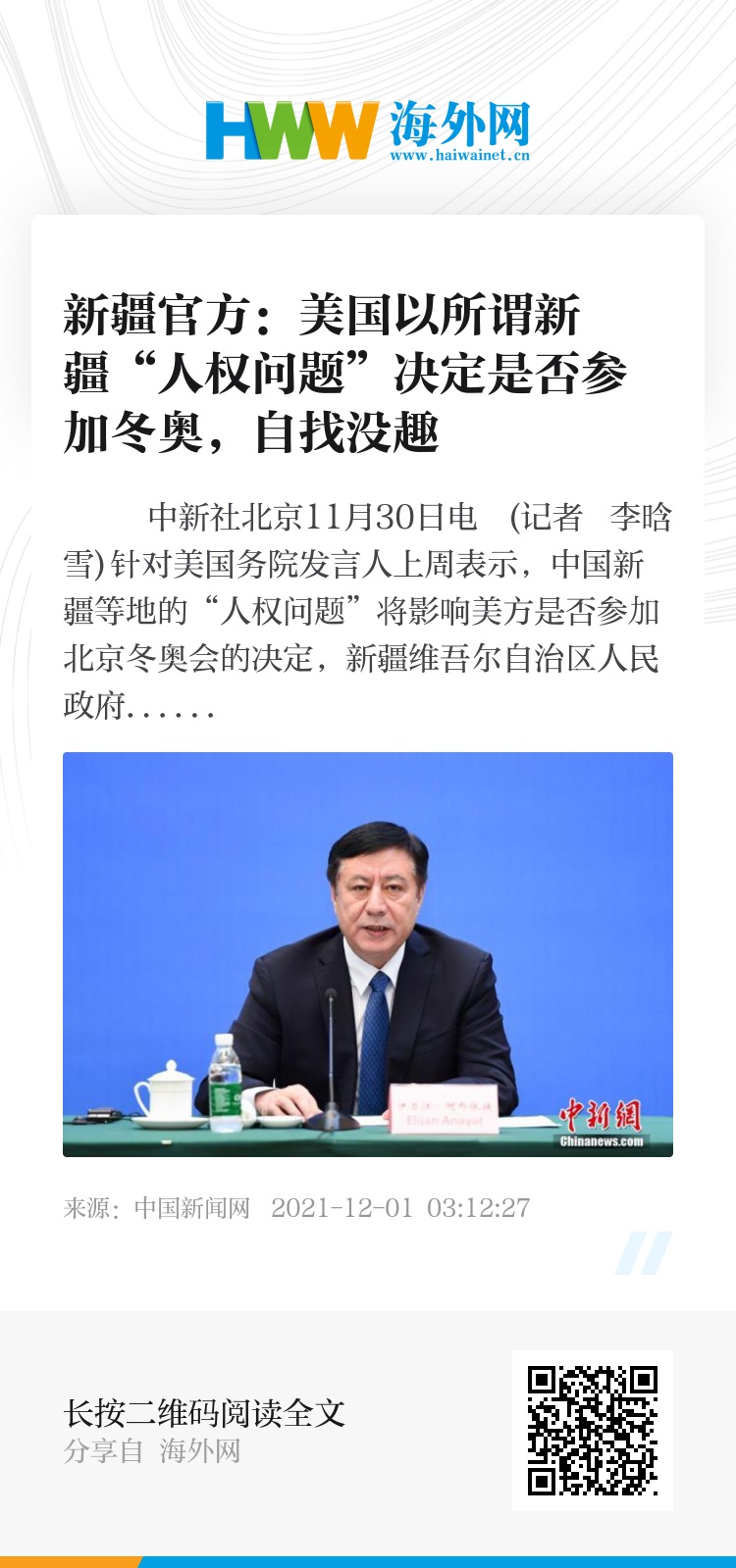 中新社北京11月30日电 (记者 李晗雪)针对美国务院发言人上周表示,中国新疆等地的“人权问题”将影响美方是否参加北京冬奥会的决定,新疆维吾尔自治区人民政府新闻发言人徐贵相30日在北京表示,美国拿所谓新疆“人权问题”说事,完全是自找没趣。