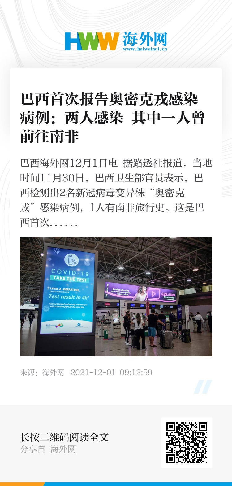 据报道,2名感染者是一对夫妻,丈夫11月23日从南非抵达巴西圣保罗,他的妻子没有旅行史。丈夫乘机抵达圣保罗国际机场时持有新冠检测阴性证明,但在启程回家前的检测中,夫妻二人的检测结果双双为阳性,并在第二次样本检测中确认携带“奥密克戎”变异株。二人均没有疫苗接种证明。