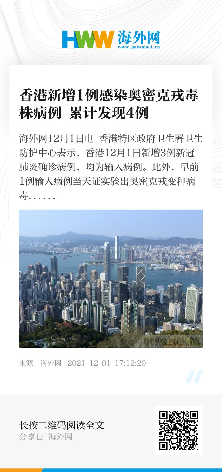 海外网12月1日电 香港特区政府卫生署卫生防护中心表示,香港12月1日新增3例新冠肺炎确诊病例,均为输入病例。此外,早前1例输入病例当天证实验出奥密克戎变种病毒,香港至今累计确诊4例感染奥密克戎病毒病例。