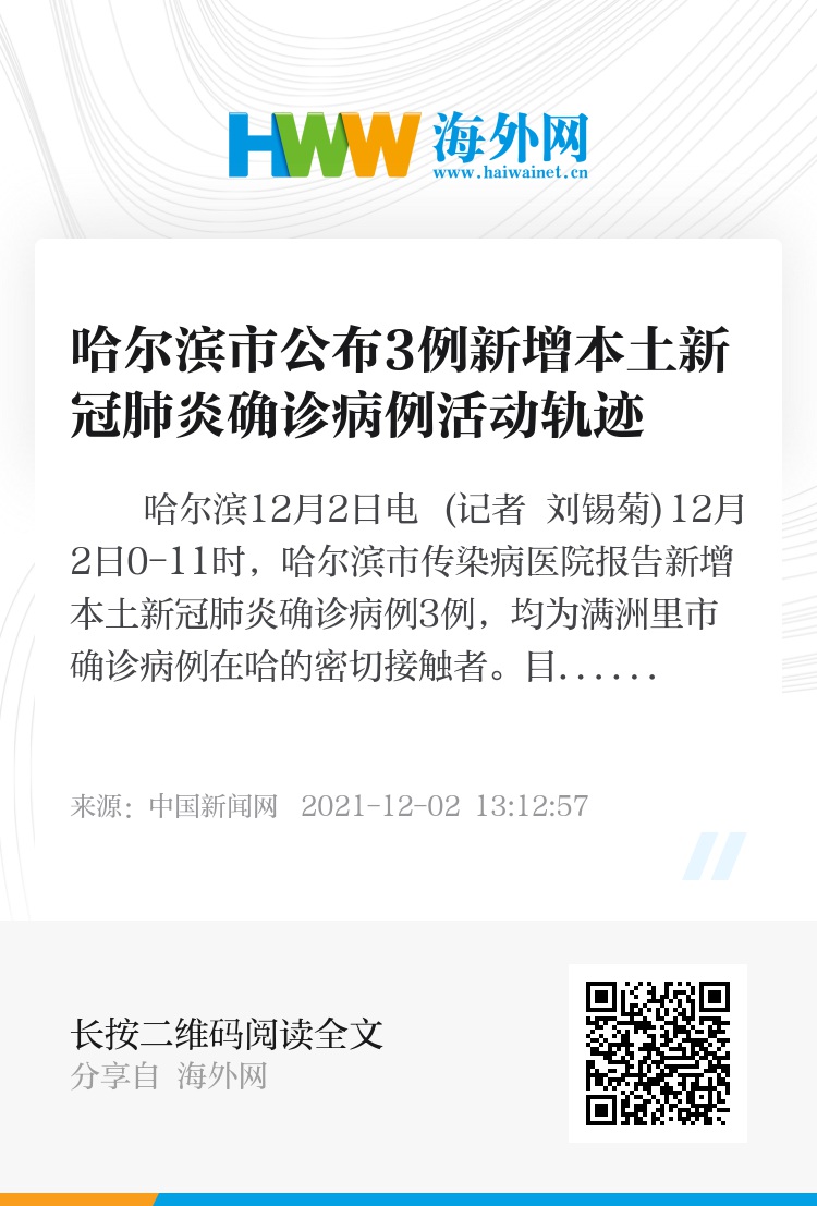中新网哈尔滨12月2日电 (记者 刘锡菊)12月2日0-11时,哈尔滨市传染病医院报告新增本土新冠肺炎确诊病例3例,均为满洲里市确诊病例在哈的密切接触者。目前在该定点医院接受隔离治疗。