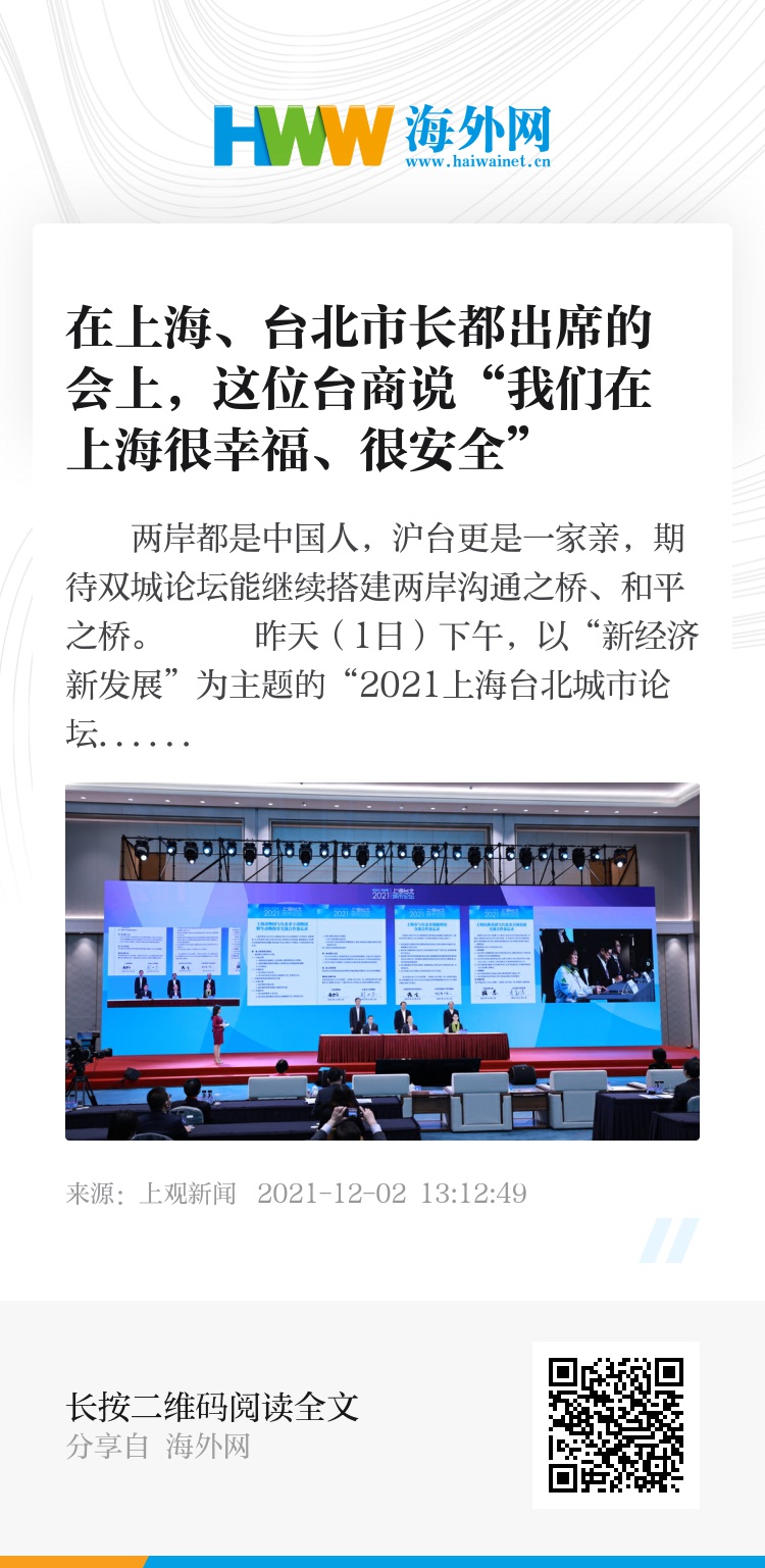 两岸都是中国人,沪台更是一家亲,期待双城论坛能继续搭建两岸沟通之桥、和平之桥。