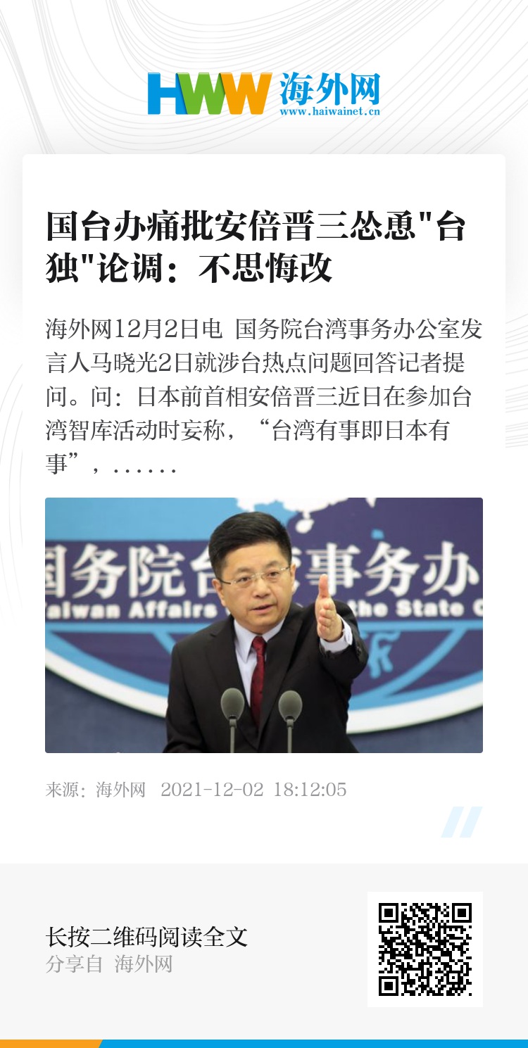 海外网12月2日电 国务院台湾事务办公室发言人马晓光2日就涉台热点问题回答记者提问。