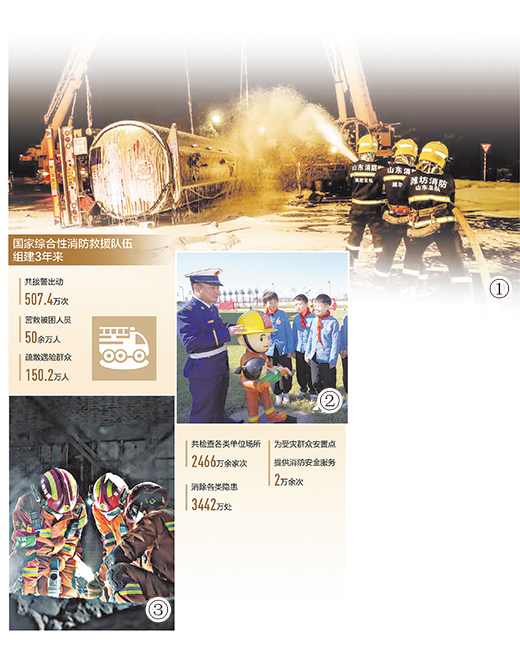 除了机制的变革,队伍职能定位和功能属性也在全面革新。“3年来,国家综合性消防救援队伍面对‘全灾种、大应急’任务需要,从救援理念、职能、能力、装备、方式、机制6个方面推动队伍转型升级。”琼色说,在原有防火灭火和以抢救人员生命为主的应急救援任务基础上,台风、地震等自然灾害和交通、危化品等事故救援,都成为国家综合性消防救援队伍的主责主业;同时聚焦专业化建设,建成地震、矿山、危化品等国家级应急救援队伍近100支2万余人,救援能力显著增强,救援效果明显提升。