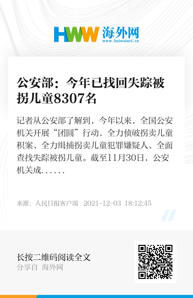 记者从公安部了解到,今年以来,全国公安机关开展“团圆”行动,全力侦破拐卖儿童积案、全力缉捕拐卖儿童犯罪嫌疑人、全面查找失踪被拐儿童。截至11月30日,公安机关成功侦破拐卖儿童积案290余起,抓获拐卖儿童犯罪嫌疑人690余名,累计找回历年失踪被拐儿童8307名,其中失踪被拐人员与亲人分离时间最长达74年。