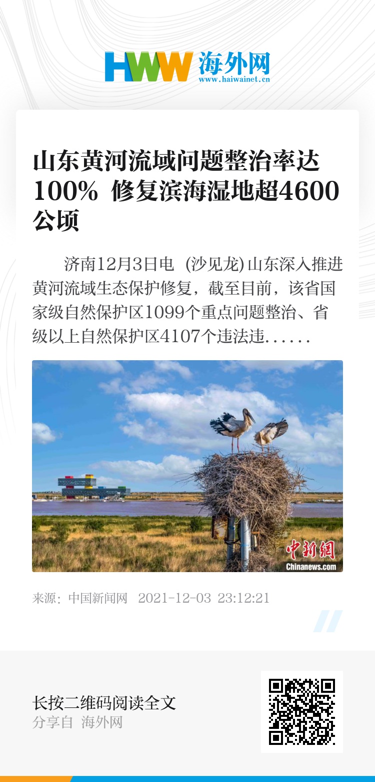 中新网济南12月3日电 (沙见龙)山东深入推进黄河流域生态保护修复,截至目前,该省国家级自然保护区1099个重点问题整治、省级以上自然保护区4107个违法违规问题整治销号率均达100%。其中,对黄河三角洲湿地累计补水4.21亿立方米,整治修复滨海湿地4675.63公顷。
