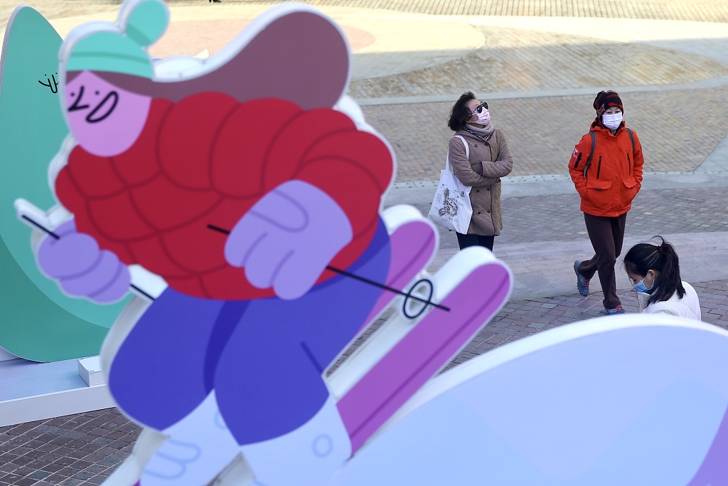 北京街头现冰雪运动雕塑宣传画 迎接北京冬奥