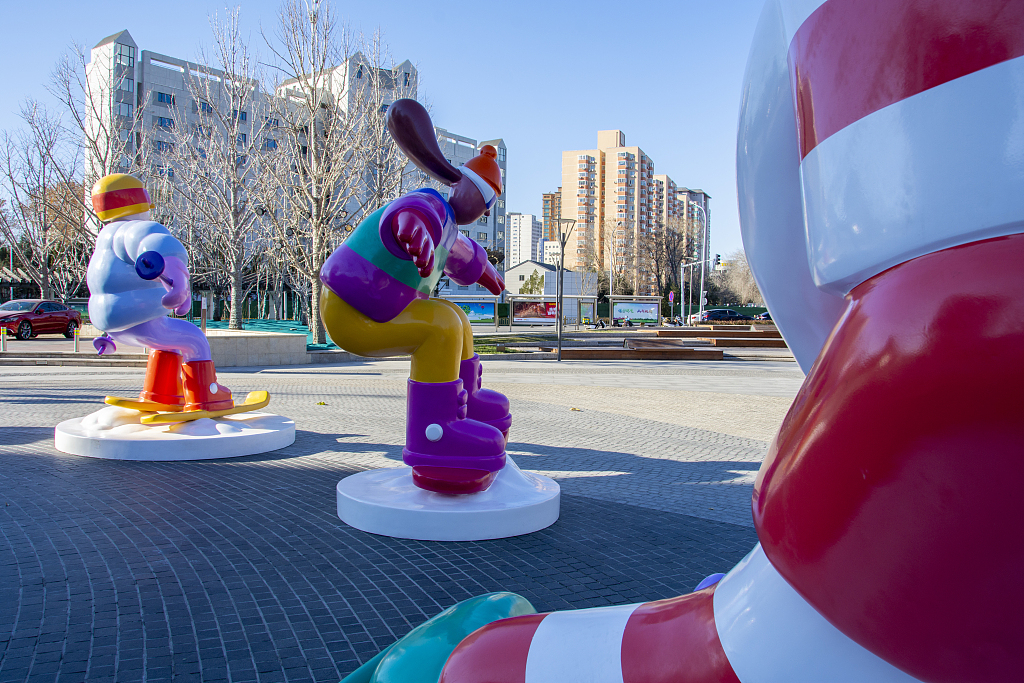 北京街头现冰雪运动雕塑宣传画 迎接北京冬奥