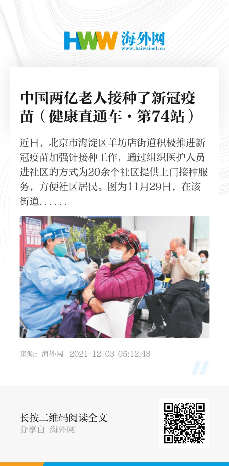 “截至目前,我国新冠病毒疫苗在境内外60岁以上老人中的接种数量已经超过了5亿剂次。”郑忠伟介绍,根据得到的数据,国外接种新冠病毒疫苗最高年龄者是106岁,国内接种我国新冠病毒疫苗最高年龄者也是106岁。疫苗在这5亿多剂次以及在高龄者接种过程中都显示出良好的安全性,而且老年人不良反应略低于成年人。