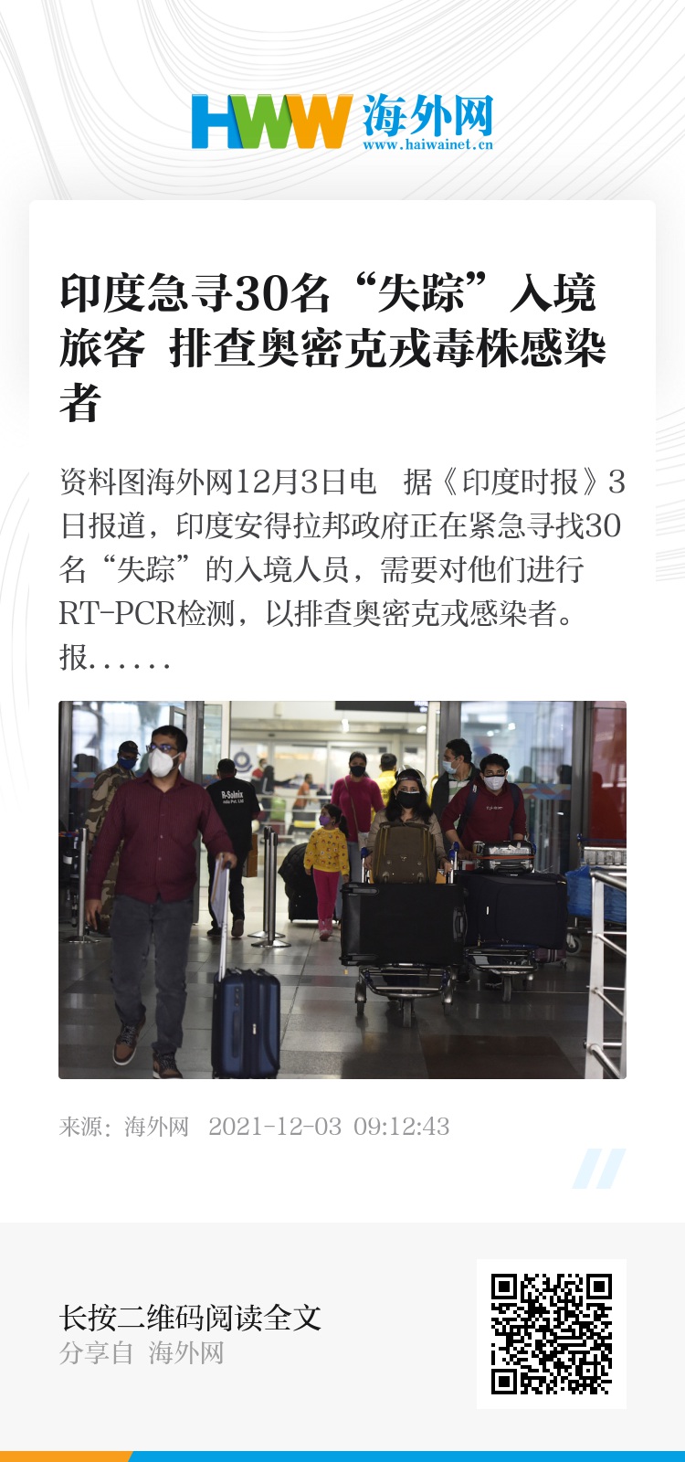 海外网12月3日电 据《印度时报》3日报道,印度安得拉邦政府正在紧急寻找30名“失踪”的入境人员,需要对他们进行RT-PCR检测,以排查奥密克戎感染者。