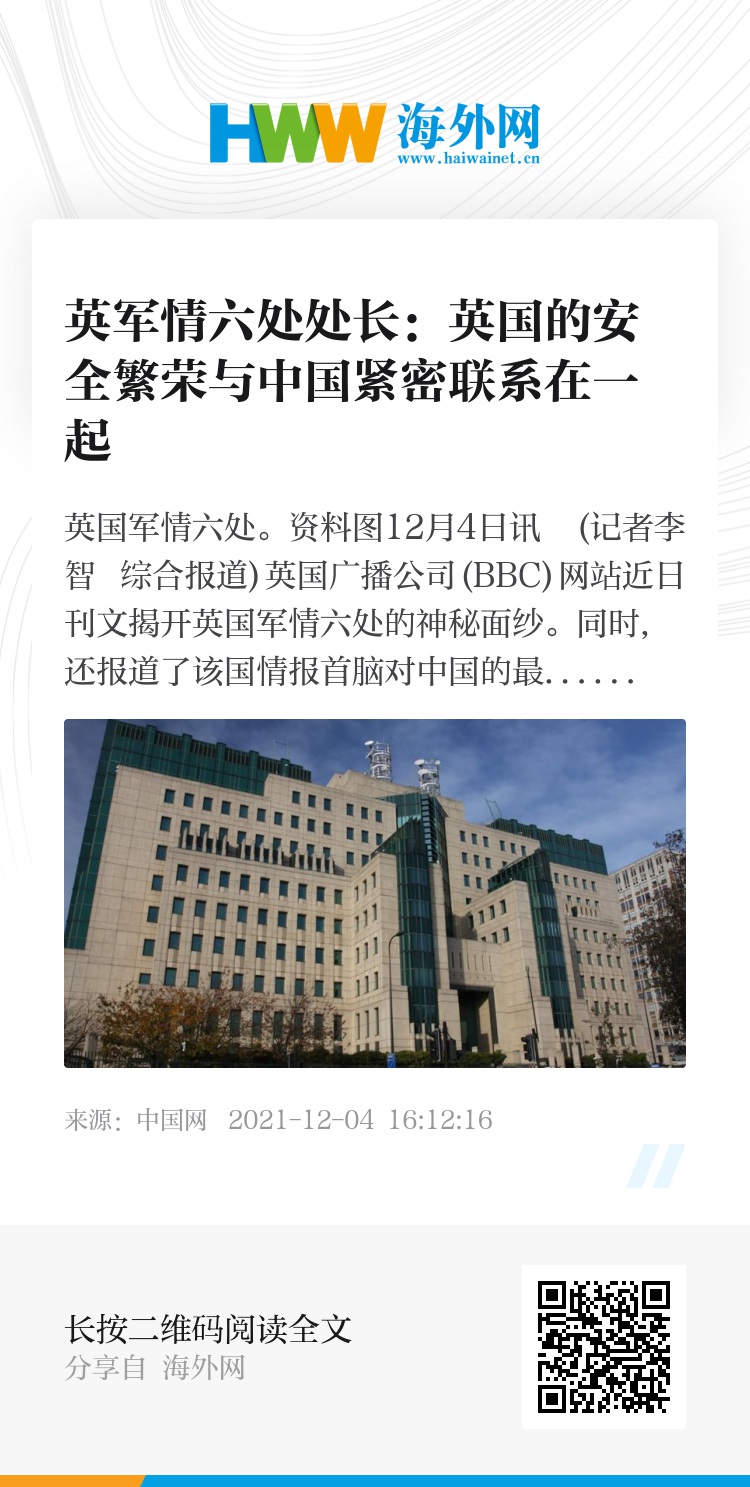 中国网12月4日讯 (记者李智 综合报道)英国广播公司(BBC)网站近日刊文揭开英国军情六处的神秘面纱。同时,还报道了该国情报首脑对中国的最新评估。