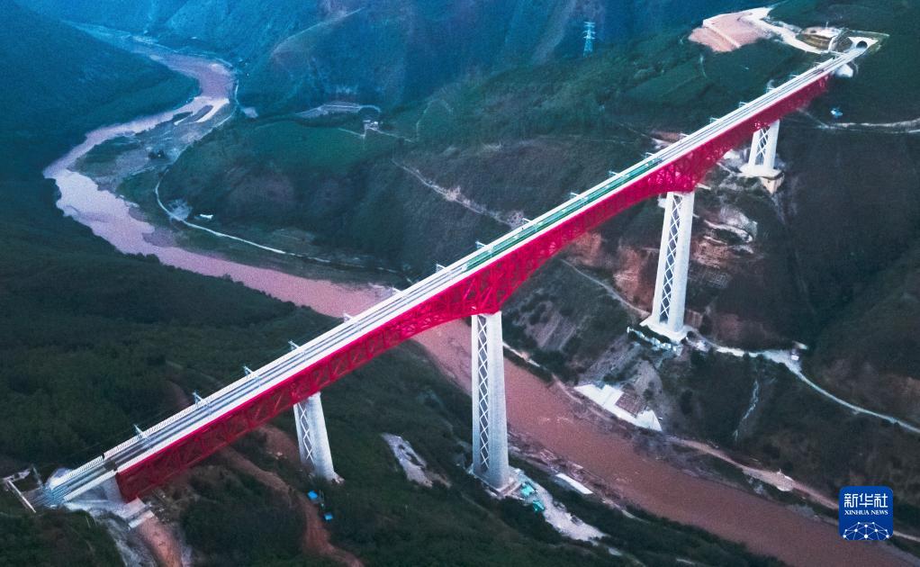 中老铁路首发列车驶过中国云南省元江哈尼族彝族傣族自治县境内的元江双线特大桥(12月3日摄,无人机照片)。12月3日,中国昆明站内的复兴号“绿巨人”、老挝万象站内的“澜沧号”动车组列车缓缓开动,开启一段跨越山河、相互奔赴的旅程。这标志着连接昆明和万象、采用中国标准的中老铁路全线开通运营。新华社记者 王冠森 摄