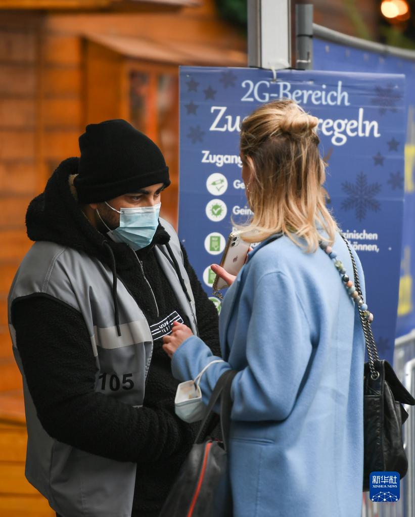 12月3日,工作人员(左)在德国法兰克福圣诞市场外检查游客的健康通行证。德国联邦与各州政府2日达成协议,加强针对未接种新冠疫苗者的社交限制,以遏制该国第四波疫情蔓延。新华社记者 逯阳 摄
