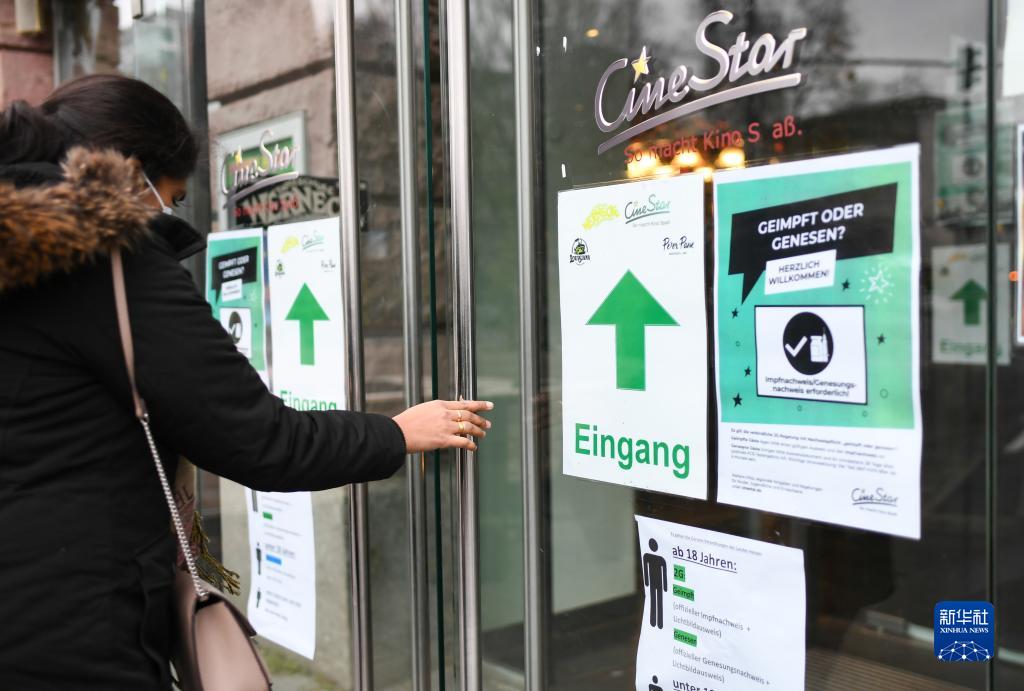 12月3日,在德国法兰克福一家电影院外,一名女子从张贴防疫提示牌的入口处进入。德国联邦与各州政府2日达成协议,加强针对未接种新冠疫苗者的社交限制,以遏制该国第四波疫情蔓延。新华社记者 逯阳 摄