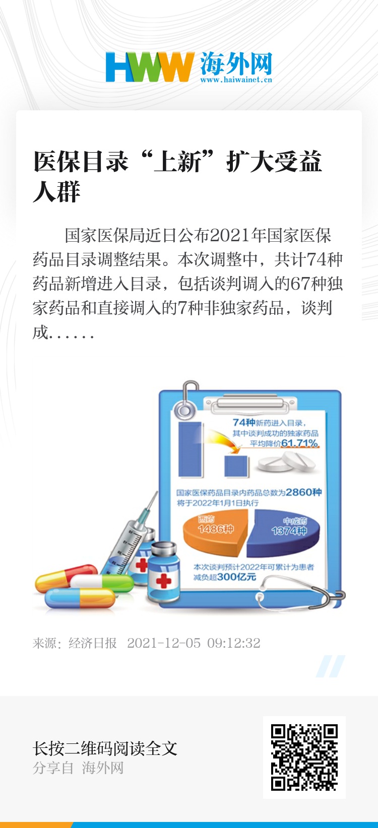 在今年的调整中,国家医保局严格把握药品的经济性,经初步测算,新增的74种药品预计2022年增加的基金支出,与目录内药品降价等腾出的基金空间基本相当,因此近期不会明显增加基金支出。从患者负担情况看,相比原市场价格,通过谈判降价和医保报销,本次谈判预计2022年可累计为患者减负超300亿元。