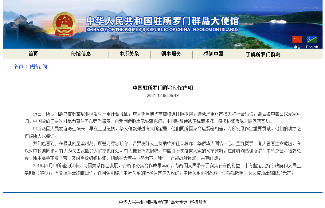 中国网12月6日讯 据中华人民共和国驻所罗门群岛大使馆网站消息,近日,所罗门群岛首都霍尼亚拉发生严重社会骚乱,唐人街等地华商店铺遭打砸抢烧,造成严重财产损失和社会恐慌,数百名中国公民无家可归。中国驻所罗门群岛使馆就此发布声明称,中国政府已多次对暴力事件予以强烈谴责,向受困侨胞表示诚挚慰问。中国驻所使馆正统筹资源,积极协调侨胞开展互帮互助。