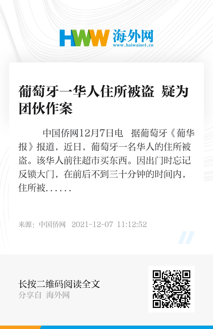 中国侨网12月7日电 据葡萄牙《葡华报》报道,近日,葡萄牙一名华人的住所被盗。该华人前往超市买东西。因出门时忘记反锁大门,在前后不到三十分钟的时间内,住所被小偷撬门进入。但因该华人离家时间很短,小偷来不及翻很多地方,只是翻了几个抽屉,偷走了部分现金。
