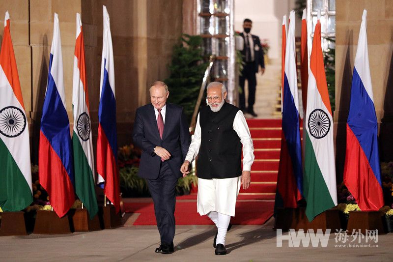 当地时间2021年12月6日,俄罗斯总统普京对印度进行为期一天的短暂访问,印俄两国领导人签署了28项协议。印度外交秘书哈什·什林拉当日晚间通报此次印俄两国领导人的会见成果时表示,加强双边贸易和投资是两国领导人会谈中的重要内容。(图:澎湃影像)