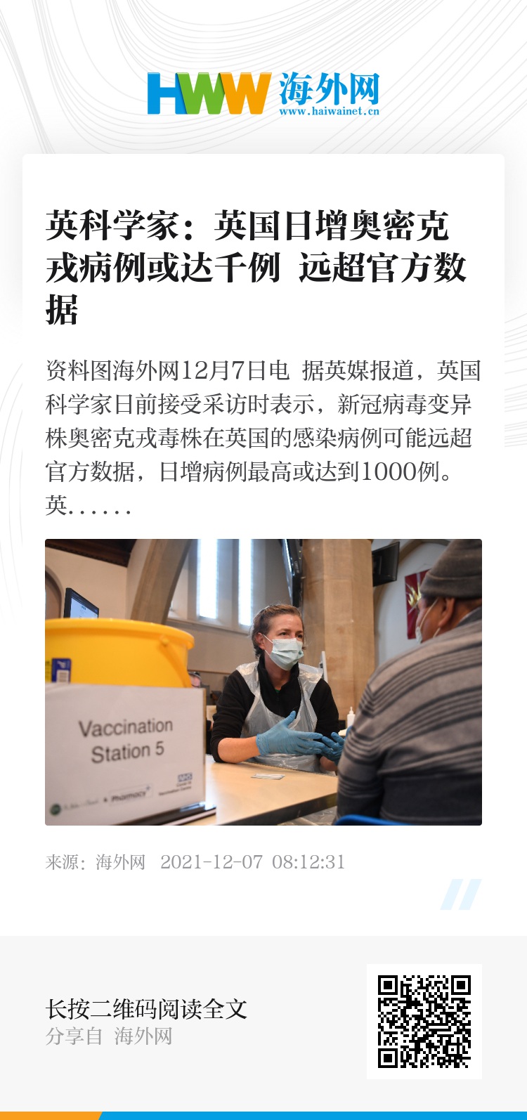 海外网12月7日电 据英媒报道,英国科学家日前接受采访时表示,新冠病毒变异株奥密克戎毒株在英国的感染病例可能远超官方数据,日增病例最高或达到1000例。