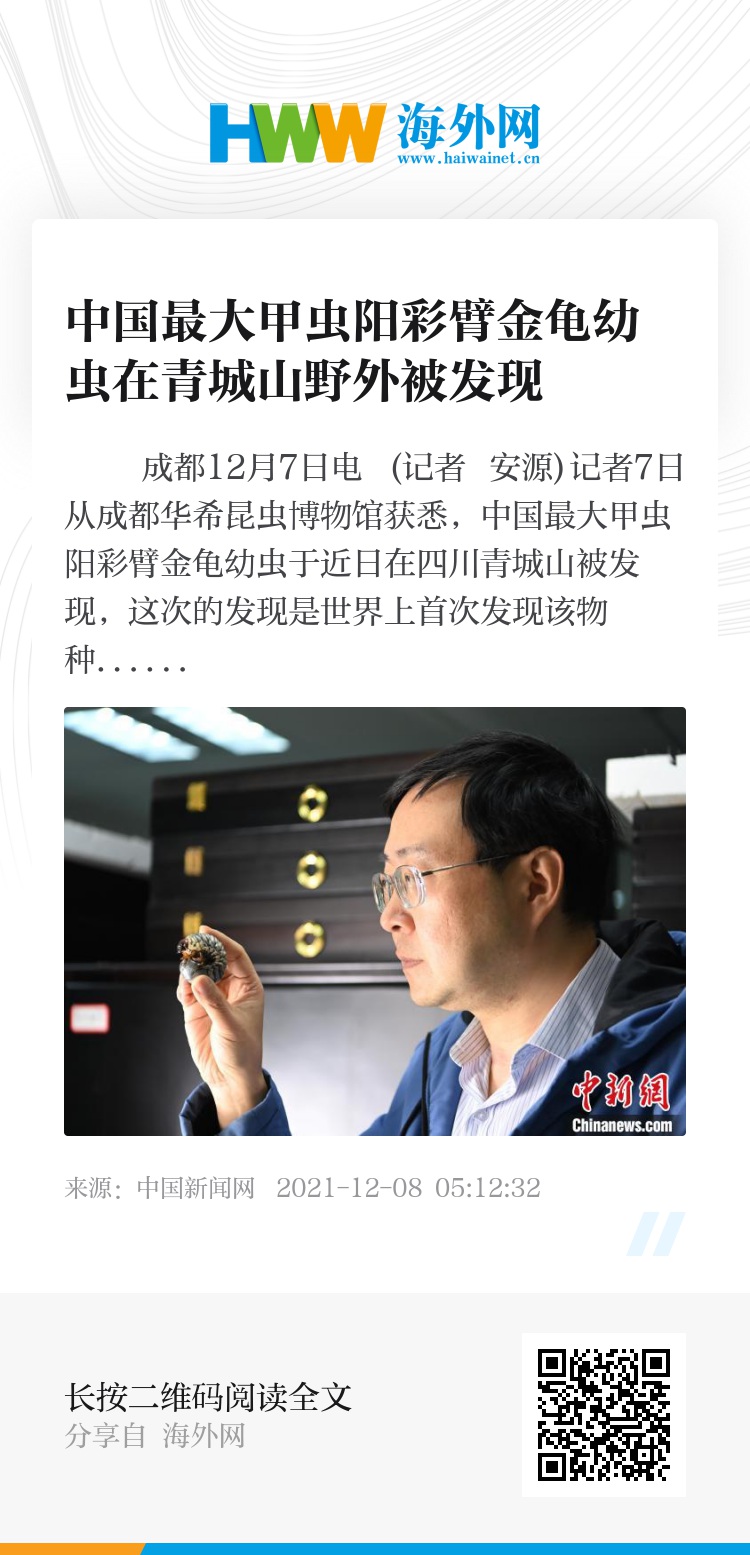 据了解,2021年12月5日,青城山下根雕师傅李万强在劈开一段酸枣木时,发现了两只阳彩臂金龟雌性成虫,同时,还发现了一条巨大的幼虫。他立即将这三只阳彩臂金龟送到了华希昆虫博物馆。博物馆馆长赵力经研究认为,这个发现刷新了关于该种的两个记录。第一个记录是在冬天发现该种,过去该种的发现报道都是夏秋季节,一般在8-9月,最晚也就是10月。更重要的是,这次发现的那条幼虫是世界上首次发现该种自然繁育的幼虫,这个发现揭开了该种幼虫在野外生存状态之谜。赵力介绍说,栖息在丛林中巨大而奇特的阳彩臂金龟,是中国最大的甲虫种类,体长可达8厘米以上,雄性拥有一对远远超过身体长度的前足。它是世界自然保护联盟濒危物种红色名录(IUCN红色名录)上的珍稀昆虫,系我国二级保护动物。分布于我国福建、江苏、浙江、江西、湖南、四川、广东、广西、海南等地,数量稀少。阳彩臂金龟过去野外发现的全部是成虫,它的幼虫在自然状态下的生活状况,一直是无人知晓。相关幼虫的报道均是采集到成虫后,人工干预下繁育的。由于不清楚它的幼虫到底吃什么,人工饲养时多采用发酵木屑或者腐殖土,因此大多数专家过去一直认为它的幼虫是生活在腐殖土里的,压根没有想到它会生活在树干里。