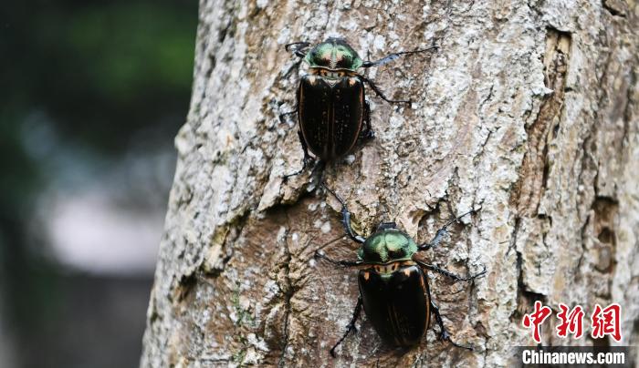 关于这个物种,赵力还介绍,它雄性超长的前足是用于求偶时抱住雌性,而雌性的前足是正常的。世界上过去认为长臂金龟属最大的种类是生活在印度尼西亚的茶色长臂金龟,该种最大记录为体长8.5厘米。实际上该属最大的应该是我国的阳彩臂金龟,华希昆虫博物馆多年前曾经收集到一只体长达8.8厘米的个体。由于巨大而稀有,它近年来成为一种网红昆虫,以至于有传言说它1982年已经灭绝。事实上它从未离开过我们,近年来国内许多地方都有发现报道。赵力认为,这次发现让我们进一步了解了这个珍稀物种的生活习性,为将来的保护工作提供了重要参考资料。