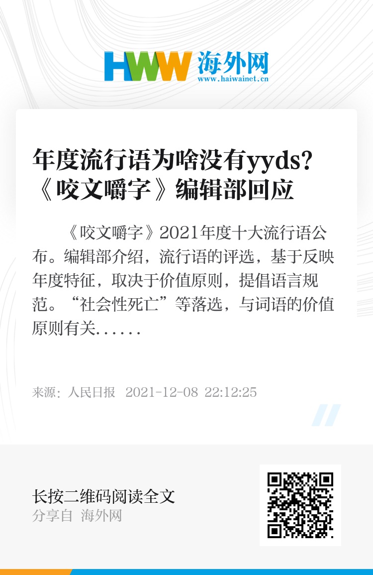 《咬文嚼字》2021年度十大流行语公布。编辑部介绍,流行语的评选,基于反映年度特征,取决于价值原则,提倡语言规范。“社会性死亡”等落选,与词语的价值原则有关;“yyds”“绝绝子”虽流行,但并不是纯正的汉语词或与典型的汉语构词规律有出入,因此也“出局”。