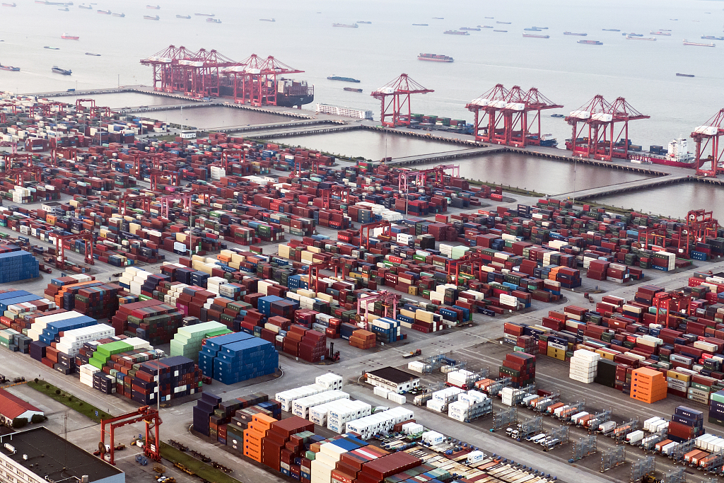 12月7日消息,中国海关总署发布的数据显示,今年前11个月,中国进出口总值35.39万亿元人民币,同比增长22%。从数据上看,今年前11月的进出口总值已超过去年(2020年全年)的32.16万亿元人民币水平。图为航拍的江苏太仓港货运码头。图片来源:中新社/视觉中国