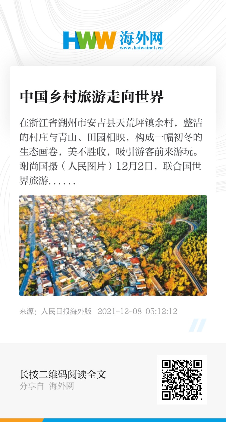12月2日,联合国世界旅游组织第24届大会公布首批“世界最佳旅游乡村”名单,中国浙江省安吉县的余村和安徽省黟县的西递村入选。根据世界旅游组织发表的新闻公报,全球共174个村庄参加这次评选,最终,来自32个国家的44个村庄成功入选,这些村庄在保护文化和自然资源、创新及变革等方面得到评委会的认可。