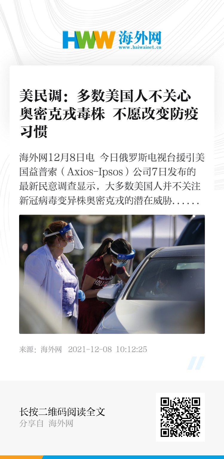 海外网12月8日电 今日俄罗斯电视台援引美国益普索(Axios-Ipsos)公司7日发布的最新民意调查显示,大多数美国人并不关注新冠病毒变异株奥密克戎的潜在威胁,不愿改变防疫习惯,以应对新毒株的蔓延。