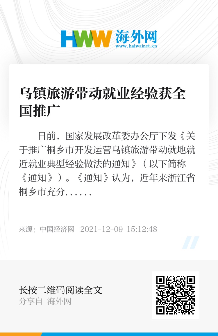 日前,国家发展改革委办公厅下发《关于推广桐乡市开发运营乌镇旅游带动就地就近就业典型经验做法的通知》(以下简称《通知》)。《通知》认为,近年来浙江省桐乡市充分利用本地要素禀赋开发运营乌镇旅游,为当地农民创造就地就近就业机会,形成了可复制可推广的典型经验做法。目前,乌镇年接待游客超1000万人次,旅游总收入超20亿元,直接和间接带动就业超过5万人。