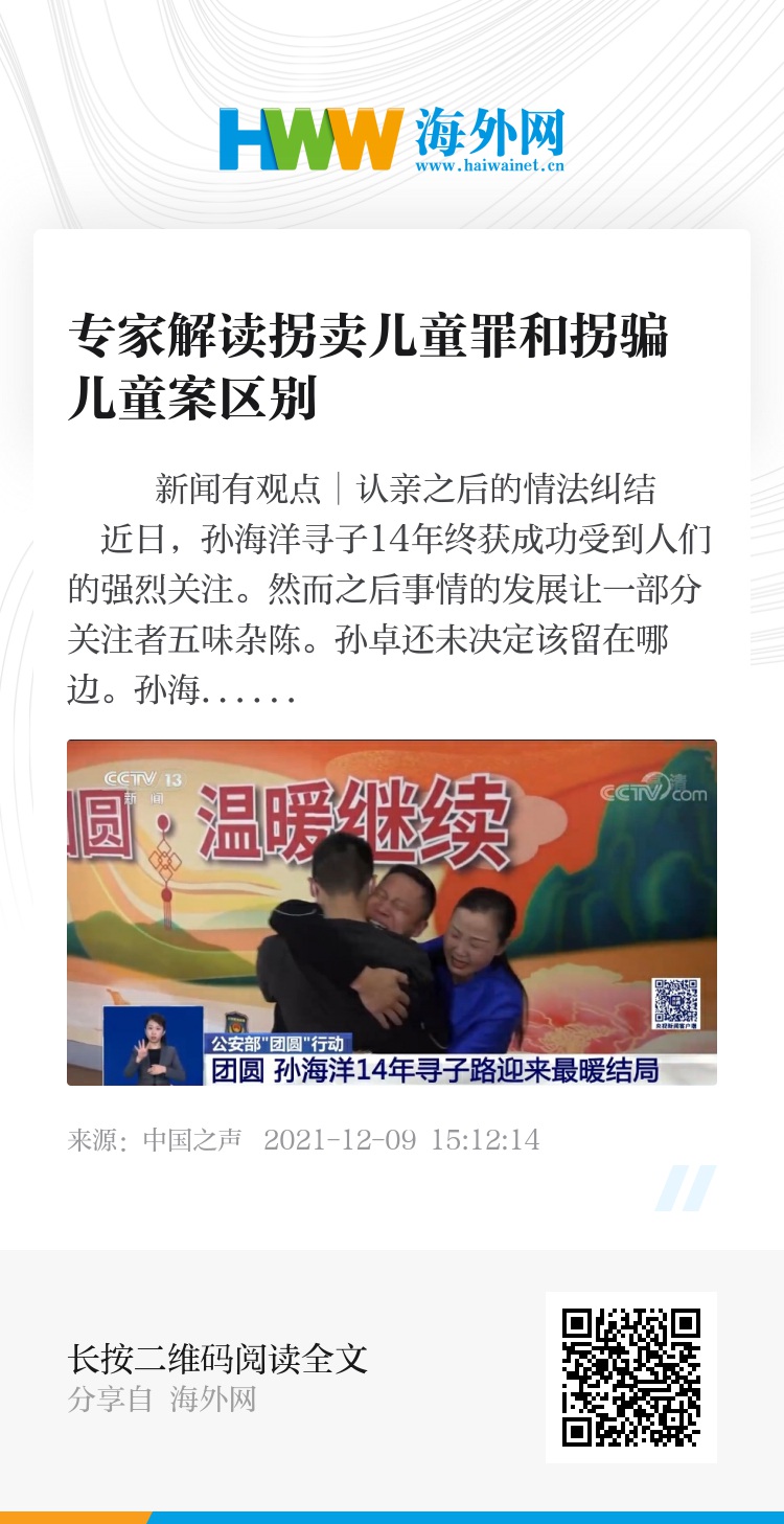 中国政法大学刑法学教授阮齐林在接受中国之声《新闻有观点》采访时提醒,公众应区分拐卖儿童罪和拐骗儿童罪,后者不存在利益驱使和买卖行为,量刑相较前者更轻。就拿符建涛一案举例,若“人贩子以送的方式送给他人抚养”的说法在此案中成立,那么该案件应属于拐骗儿童案。