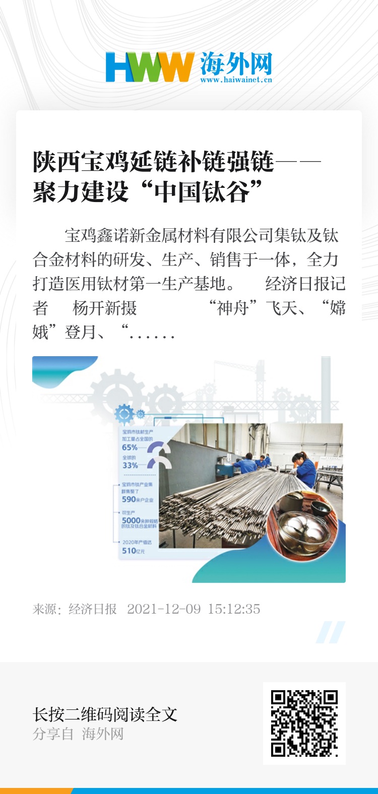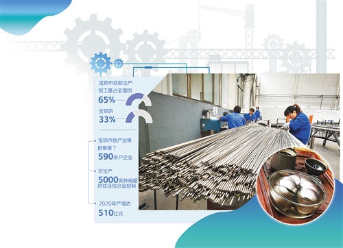 在宝鸡,像宝鸡鑫诺新金属材料有限公司这样的企业并不少,这些企业各有特色且聚点成链、聚链成群。据统计,宝鸡钛产业集群集聚了590余户企业,可生产5000余种规格的钛及钛合金材料,2020年产值达到510亿元,拥有国家级研发、检测等服务平台16家。