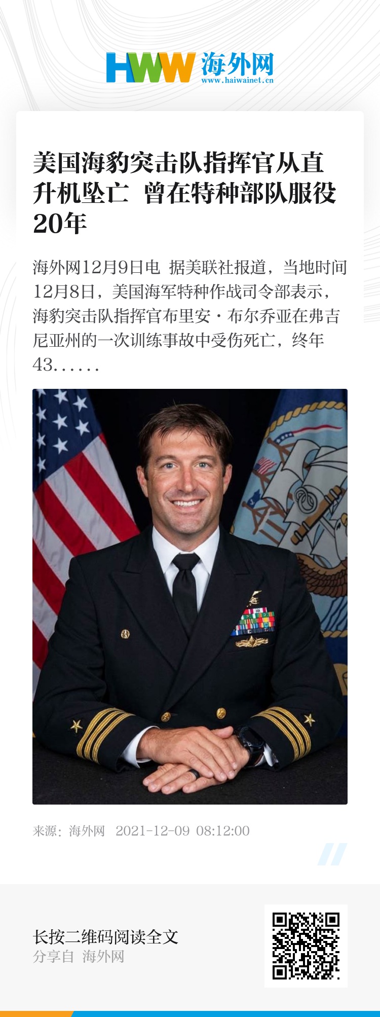 海外网12月9日电 据美联社报道,当地时间12月8日,美国海军特种作战司令部表示,海豹突击队指挥官布里安·布尔乔亚在弗吉尼亚州的一次训练事故中受伤死亡,终年43岁,留下妻子与5个孩子。