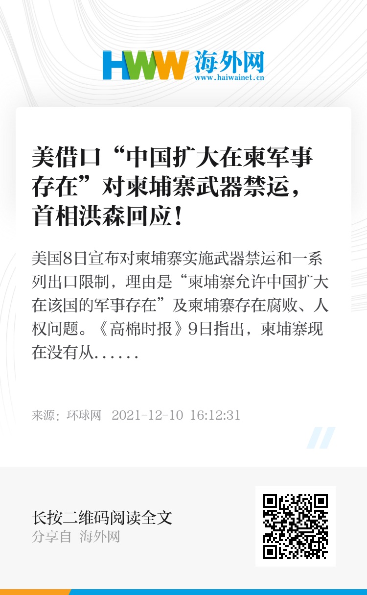 美国8日宣布对柬埔寨实施武器禁运和一系列出口限制,理由是“柬埔寨允许中国扩大在该国的军事存在”及柬埔寨存在腐败、人权问题。《高棉时报》9日指出,柬埔寨现在没有从美国进口任何武器,因此该禁令毫无意义。柬埔寨首相洪森同日表示,美国一直以各种理由威胁柬埔寨,“我才不在乎”。值得一提的是,美国在全球80多个国家和地区拥有近800个海外军事基地,却不容许别国在军事领域与中国合作的任何可能。中国外交部发言人汪文斌9日表示,一段时间以来,美方持续炒作抹黑中柬之间的正常交往合作,对柬威胁、施压、制裁,是典型的霸权主义和霸凌行径,同国际关系基本准则背道而驰,中方对此坚决反对。