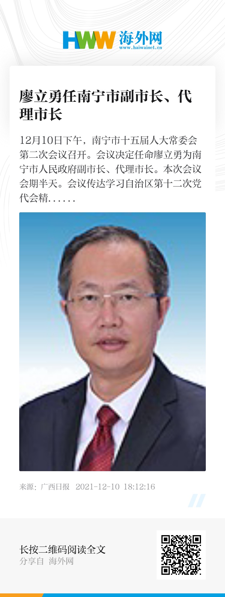 12月10日下午,南宁市十五届人大常委会第二次会议召开。会议决定任命廖立勇为南宁市人民政府副市长、代理市长。