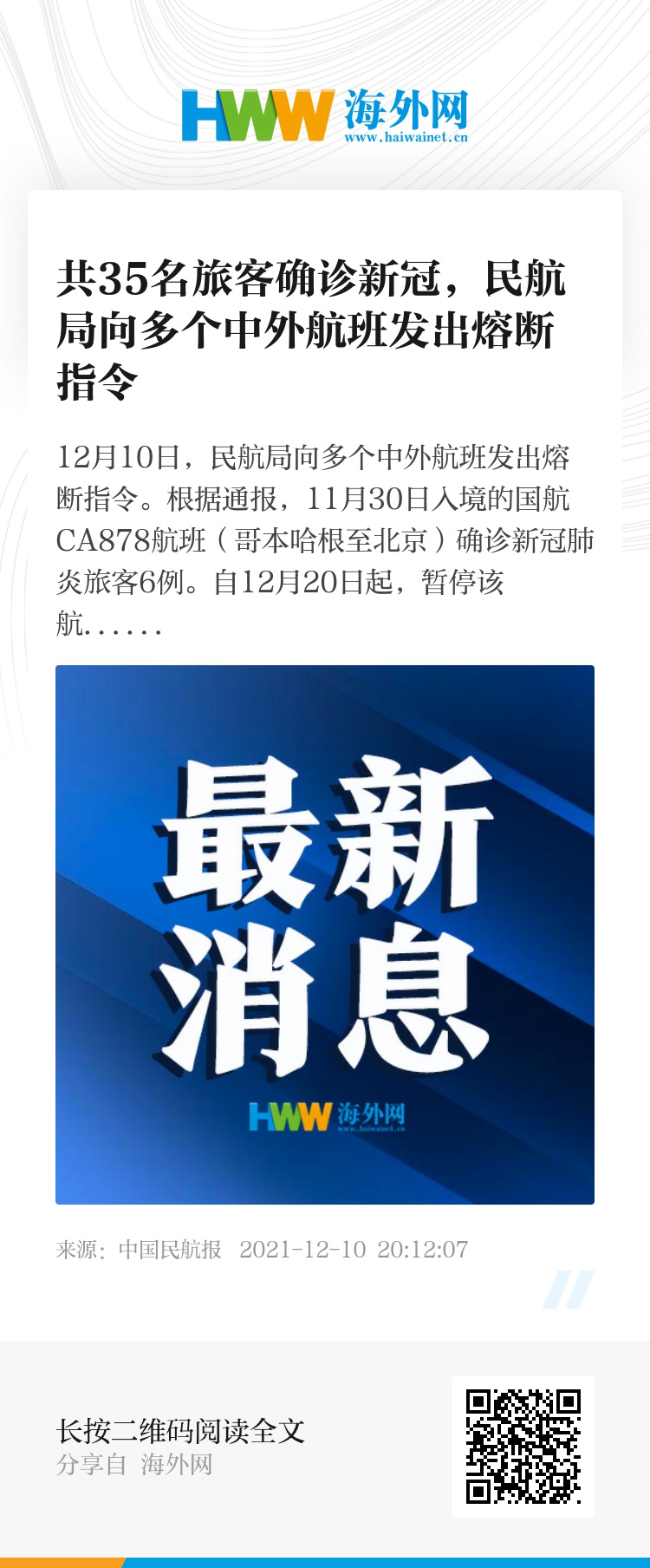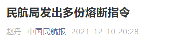 12月10日,民航局向多个中外航班发出熔断指令。