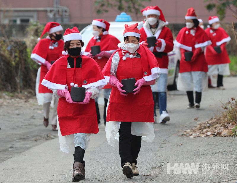 当地时间2021年12月10日上午,韩国光州,北区龙凤洞的一个住宅区内,穿着圣诞老人服装的社区工作人员和志愿者给弱势阶层的居民们送蜂窝煤,帮助他们温暖过冬。(图:东方IC)