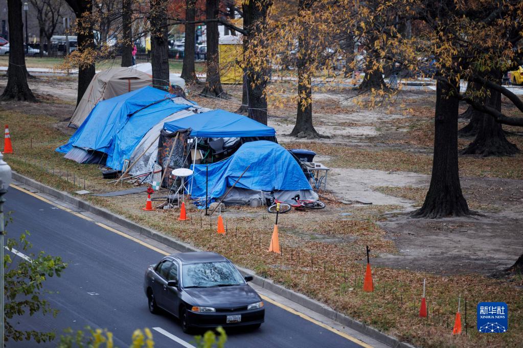 12月8日,在美国华盛顿,车辆行驶经过无家可归者居住的帐篷。据美国媒体报道,目前首都华盛顿地区有超过6000名无家可归者,他们的帐篷分布在100多个大小不一的临时营地里,多位于地下通道、公园、路边草坪等区域。冬天里,这些无家可归者不但要抵御寒冷考验,还要在政府采取清理措施时随时“搬家”。新华社发(沈霆 摄)