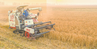 江苏省泗洪县临淮镇大型收割机在收割晚稻。张连华摄
