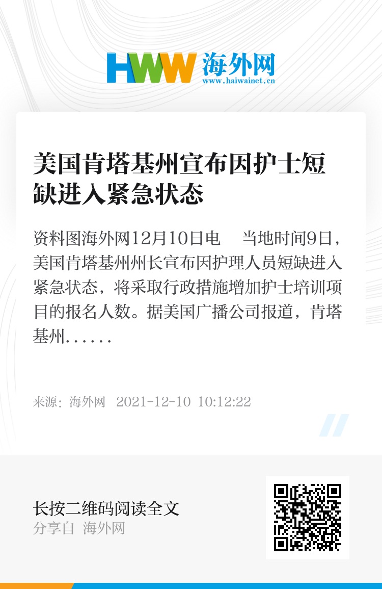海外网12月10日电 当地时间9日,美国肯塔基州州长宣布因护理人员短缺进入紧急状态,将采取行政措施增加护士培训项目的报名人数。