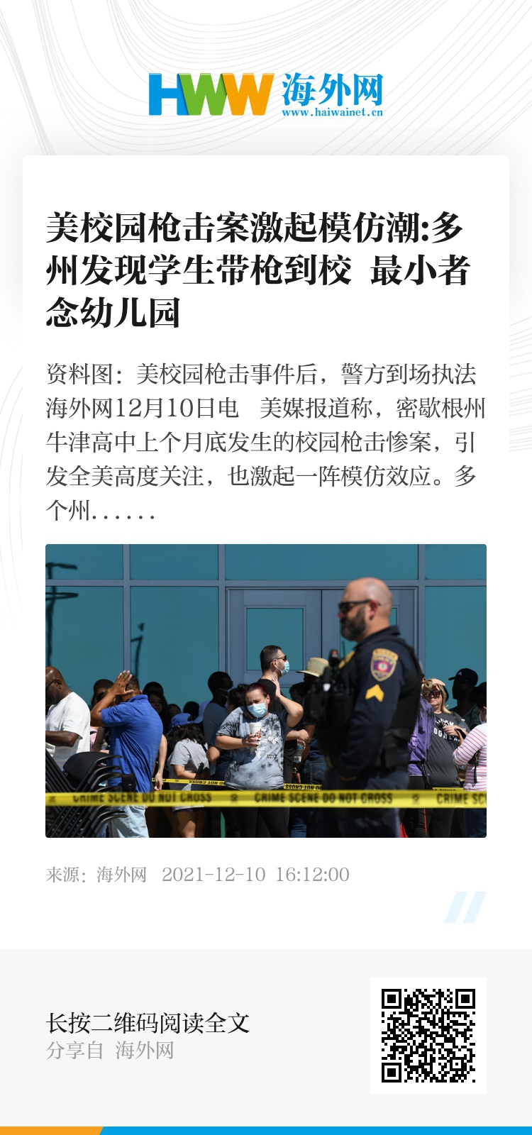 海外网12月10日电 美媒报道称,密歇根州牛津高中上个月底发生的校园枪击惨案,引发全美高度关注,也激起一阵模仿效应。多个州发现学生带枪到校园,其中最小者仅上幼儿园,有些学生甚至发表在校园犯下暴力罪行的言论遭到警方拘留。