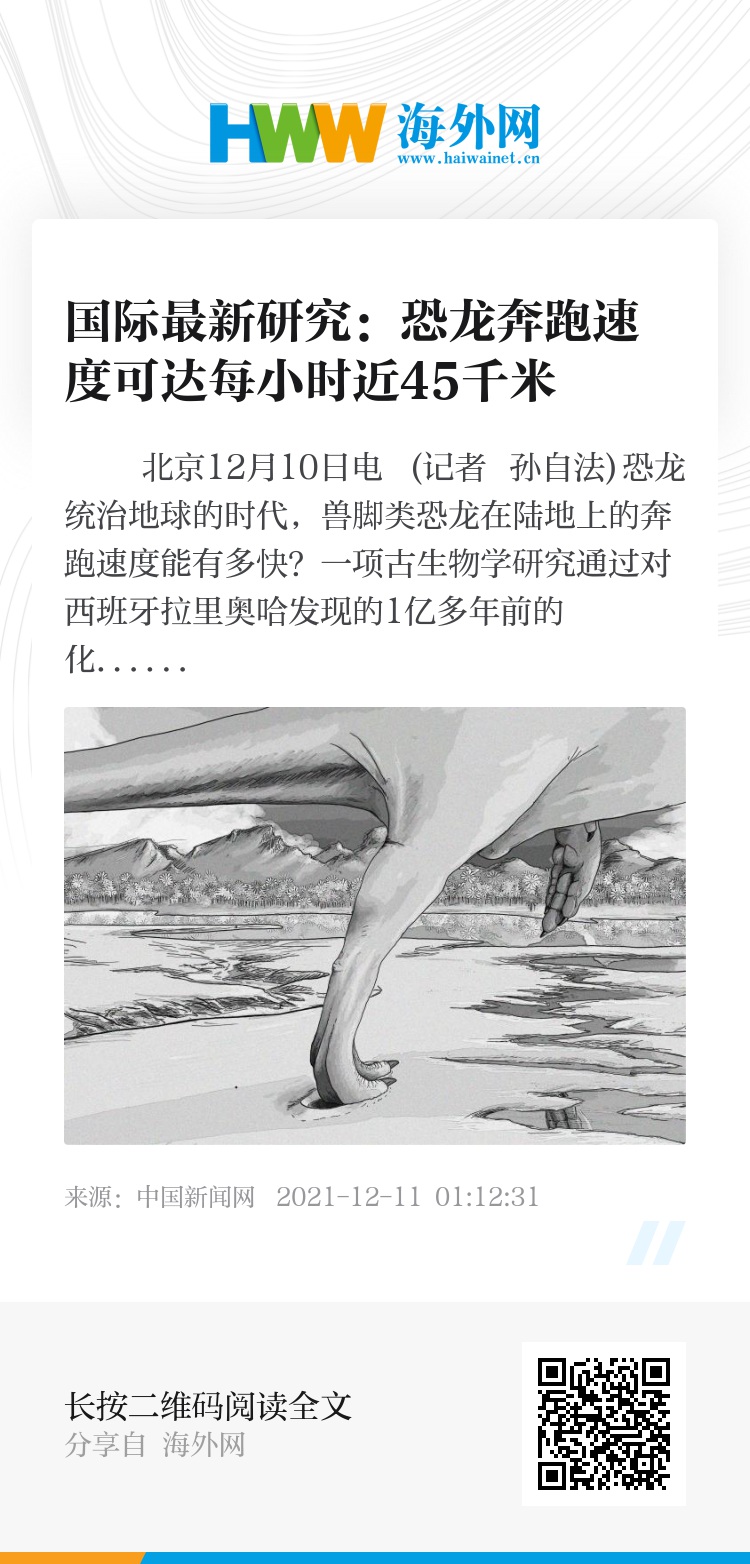 中新网北京12月10日电 (记者 孙自法)恐龙统治地球的时代,兽脚类恐龙在陆地上的奔跑速度能有多快?一项古生物学研究通过对西班牙拉里奥哈发现的1亿多年前的化石足印分析显示,一些兽脚类物种——两足行走的捕食性恐龙的奔跑速度能达到每小时近45千米。
