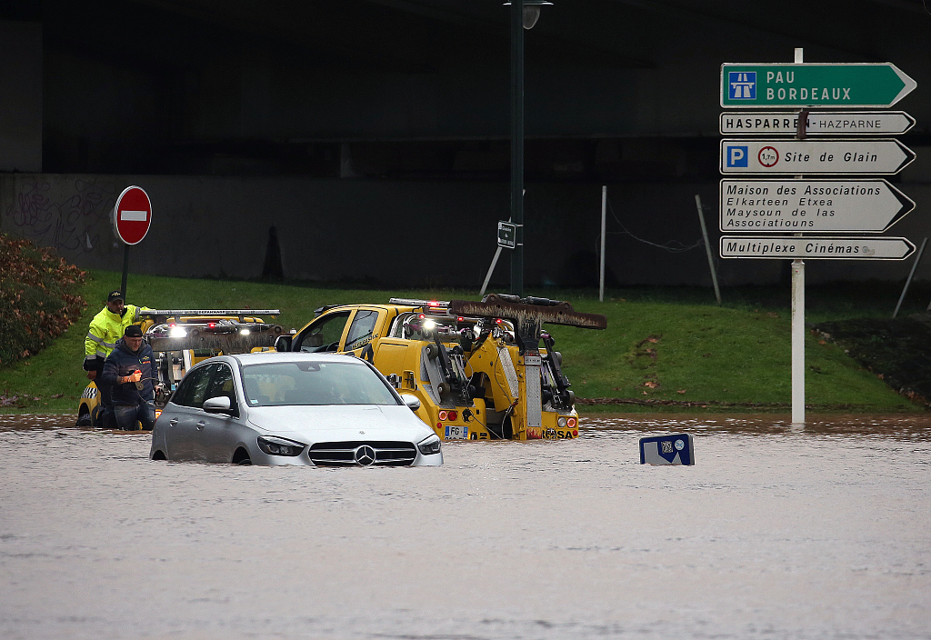 当地时间2021年12月10日,法国巴约讷,暴雨引发洪水导致街道被淹没。图源:视觉中国