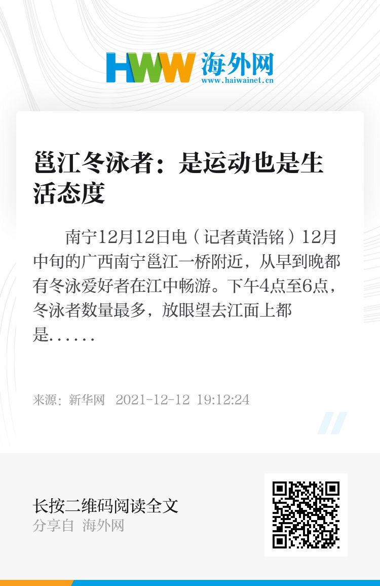 新华社南宁12月12日电(记者黄浩铭)12月中旬的广西南宁邕江一桥附近,从早到晚都有冬泳爱好者在江中畅游。下午4点至6点,冬泳者数量最多,放眼望去江面上都是冬泳者的身影。