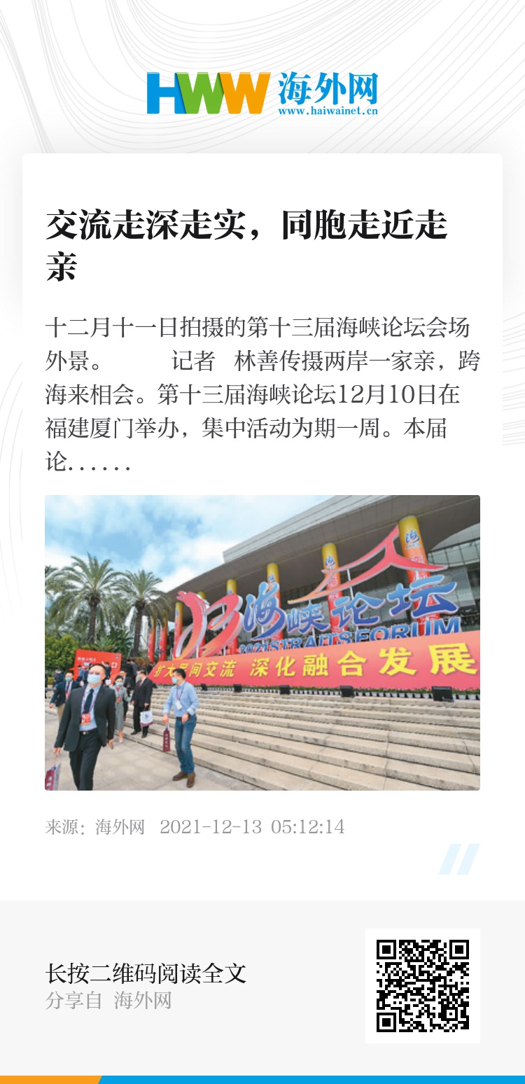 两岸一家亲,跨海来相会。第十三届海峡论坛12月10日在福建厦门举办,集中活动为期一周。本届论坛延续“扩大民间交流、深化融合发展”主题,采用线上线下结合、集中分散结合的举办方式,安排了青年交流、基层交流、文化交流、经济交流四大版块41场活动,持续聚焦两岸基层民众和青少年交流。海峡两岸的新朋老友相约八闽,畅叙乡情、交流互鉴、洽谈合作,讲述血浓于水的生动故事,展望和平发展的美好未来。